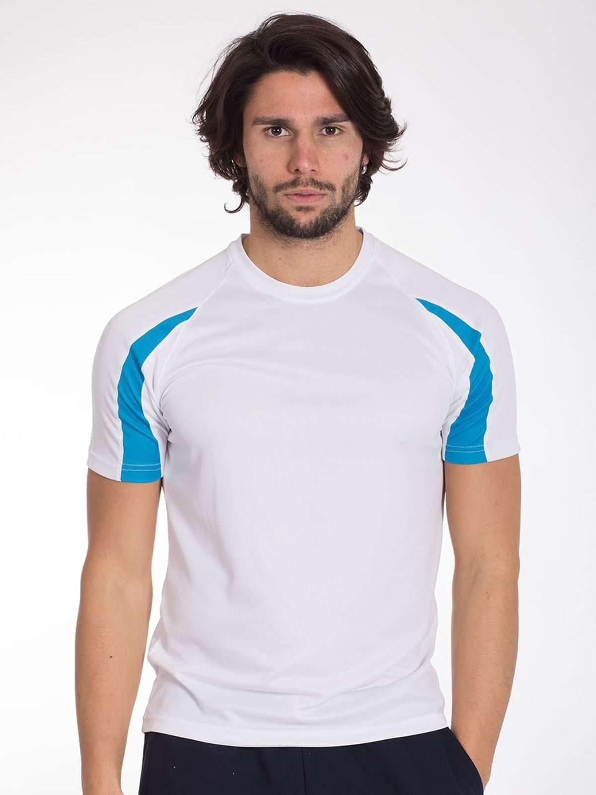 100% poliestere testurizzato. T-shirt maniche corte raglan, tessuto leggero, regolazione dell'umidità ad asciugatura rapida, inserti su maniche e parasudore all'interno del collo di colore contrastante, struttura con cuciture laterali.