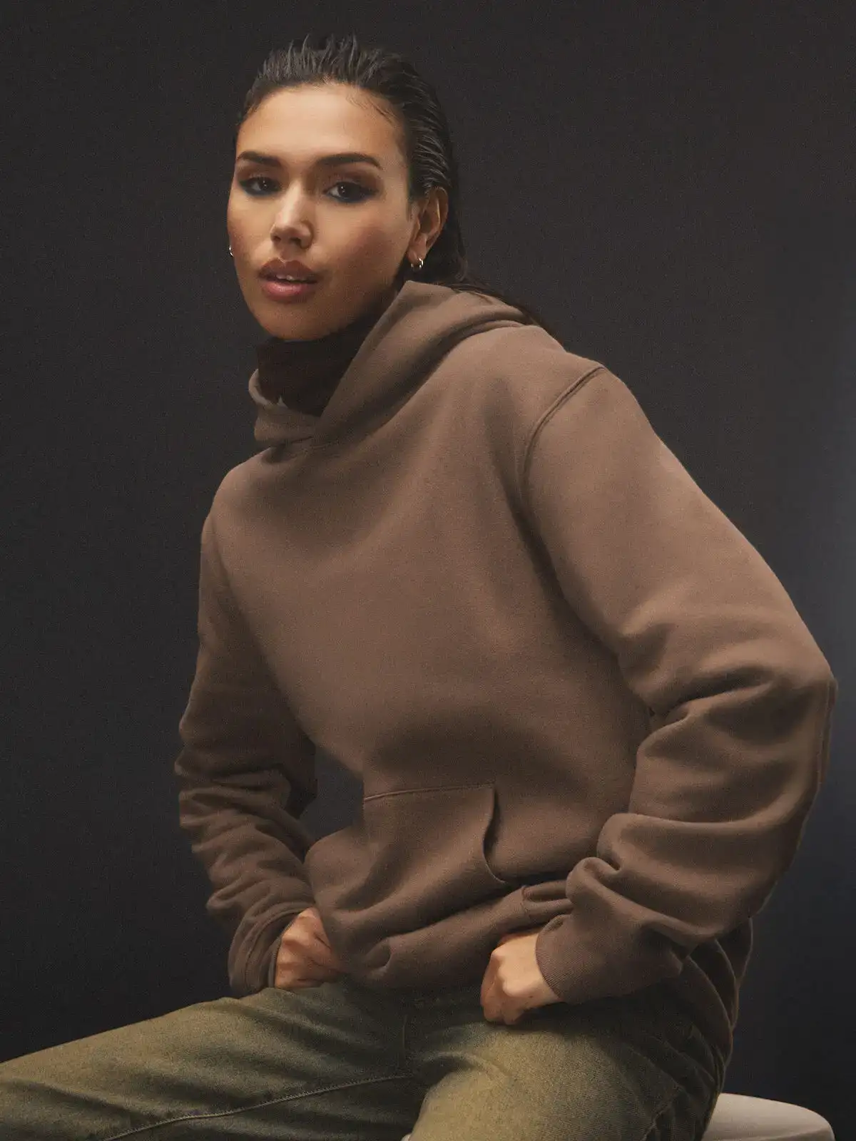 60% cotone pettinato Airlume e filato ad anelli, 40% poliestere. Felpa con cappuccio a doppio strato (senza coulisse), interno felpato, struttura con cuciture laterali, polsini e vita a costine, una tasca unica frontale. Vestibilit?? rilassata. Manica leggermente scesa. Etichetta strappabile.