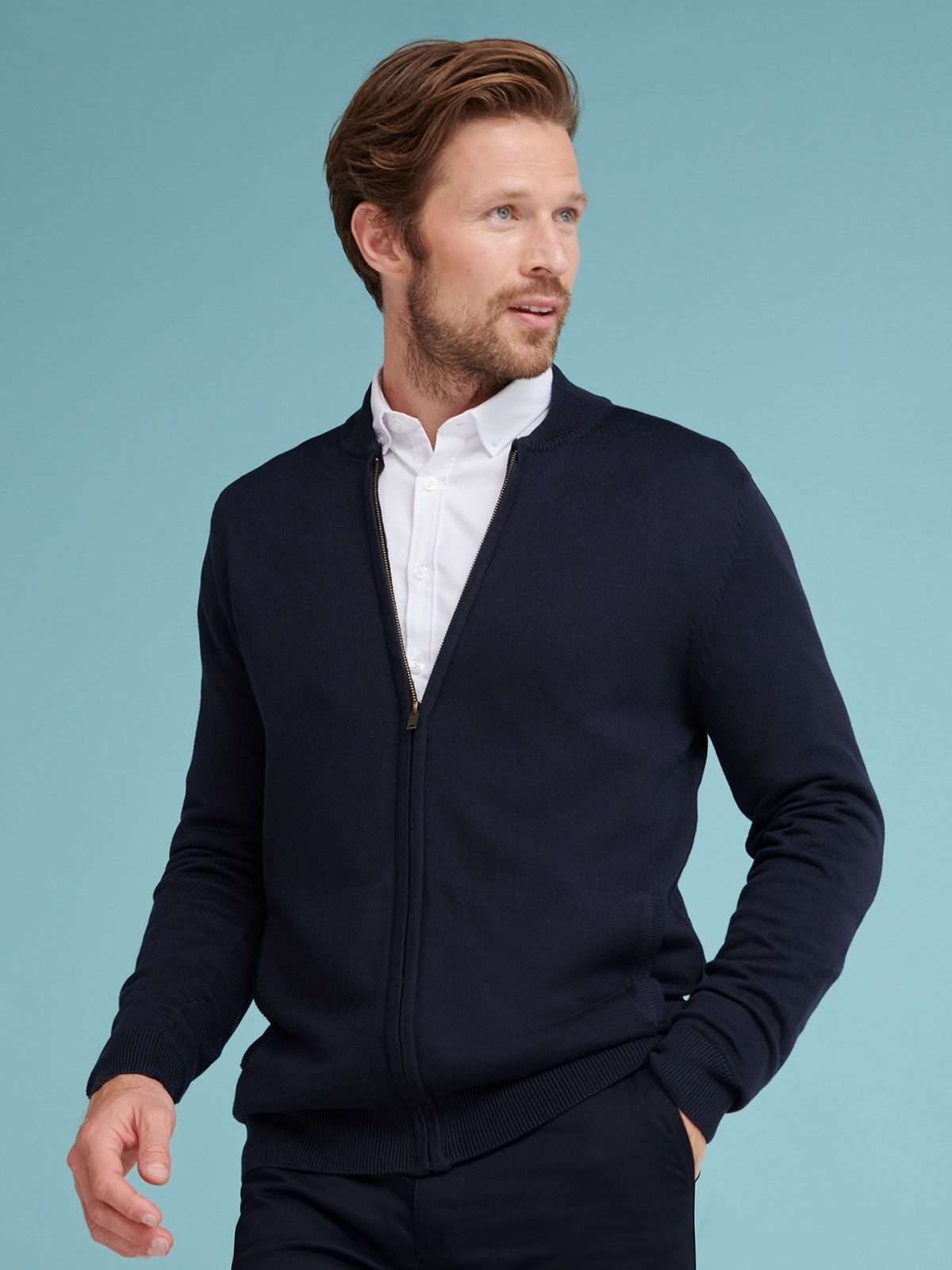 50% cotone 50% acrilico. Bomber unisex a maglia fine con manica semi-modellata, apertura frontale con zip in metallo, tasche frontali.