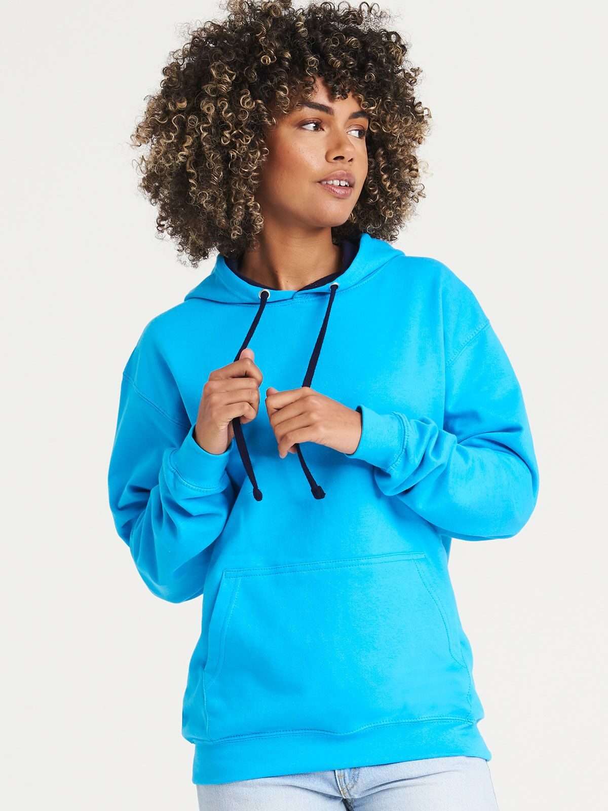 80% cotone, 20% poliestere. Felpa unisex con maniche set-in, parte interna del cappuccio e cordoncino piatto di colore contrastante, tasche frontali a marsupio, felpata internamente, struttura con cuciture laterali.