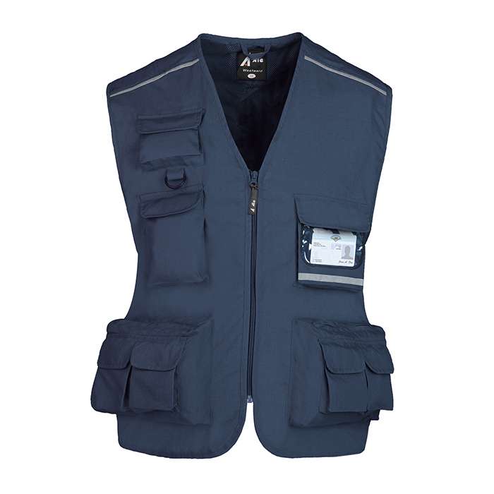 gilet in policotton multitasche; chiusura con zip; fodera interna in tessuto traspirante; tasca frontale con portabadge a scomparsa; profili rifrangenti; doppia tasca sul retro; gancio portachiavi