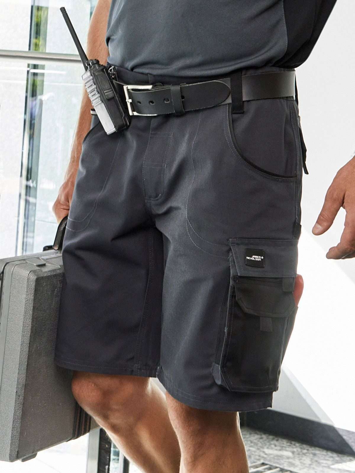 65% poliestere, 35% cotone. Pantaloni con dettagli funzionali, tessuto misto robusto, tasche rinforzate con CORDURA, varie tasche multi-funzionali per attrezzi da lavoro.